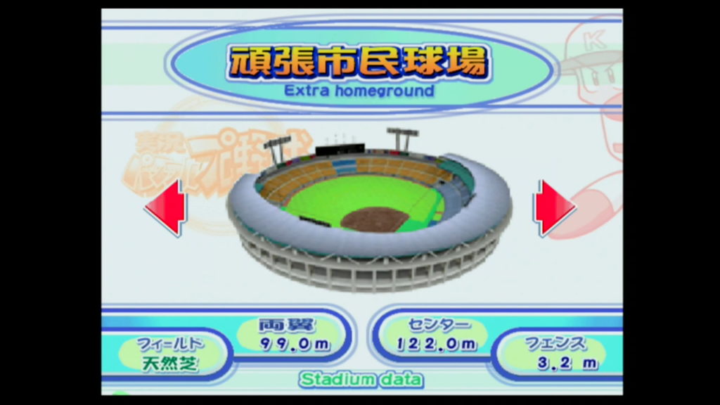 コマンドが成功すると音が鳴り、球場選択画面に「ゴールドスタジアム」と「猪狩ドーム」と「頑張市民球場」と「地方球場」が出現するのだ。