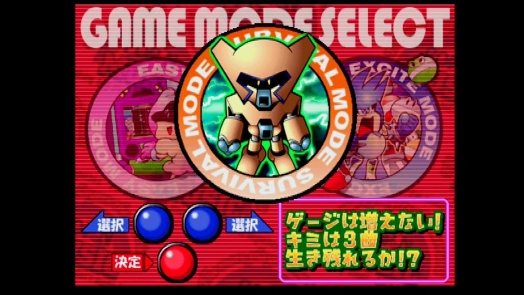 - 「アーケード」モードのゲームモードセレクト画面で「ノーマルモード」にカーソルを合わせて「セレクトボタン」を押す。