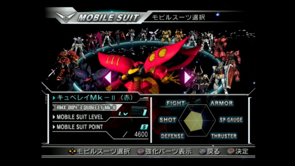 | キュベレイMk-Ⅱ(黒) | 以下の条件をすべて満たす 「オフィシャルモード」を「ジュドー」でクリアする 「オリジナルモード」を「ドモン」でクリアする |
