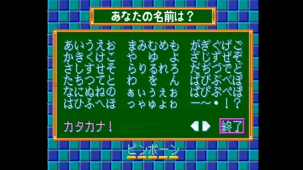 「ひとりでプレイ」モードの「根性」レベルを選択したら、名前を「たかみ」と入力しよう。