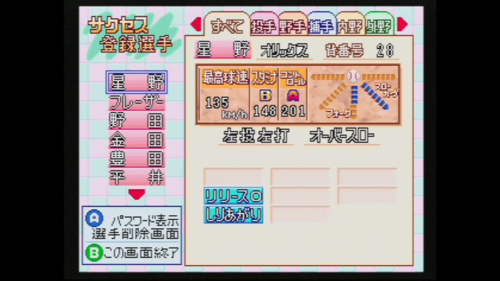 「サクセス」モードの「いままで作った選手のデータをみる・けす」を選択したら、「Cボタンユニット▲(x2)、Cボタンユニット▼(x2)、Cボタンユニット◀、Cボタンユニット▶、Cボタンユニット◀、Cボタンユニット▶、Lボタン、Rボタン」の順に入力しよう。