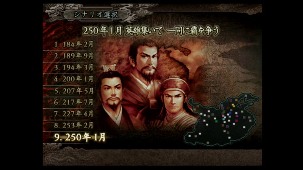 以下のどちらかの条件を満たすと、シナリオ選択画面にシナリオ9「250年1月 英雄集いて 一同に覇を争う」が出現するぞ。