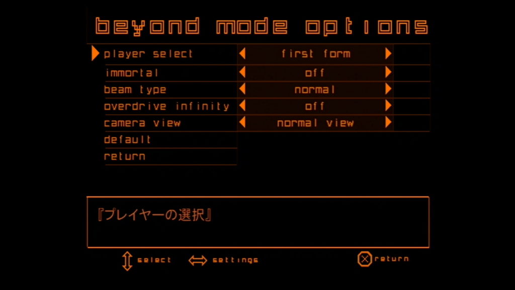 「player select」のすべてのオプションはゲームを累計10時間以上プレイすることでもすべて出現する。