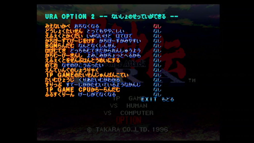 - タイトルメニュー画面で「OPTION」モードにカーソルを合わせたら、「Rボタン」を押しながら「スタートボタン」を押す。