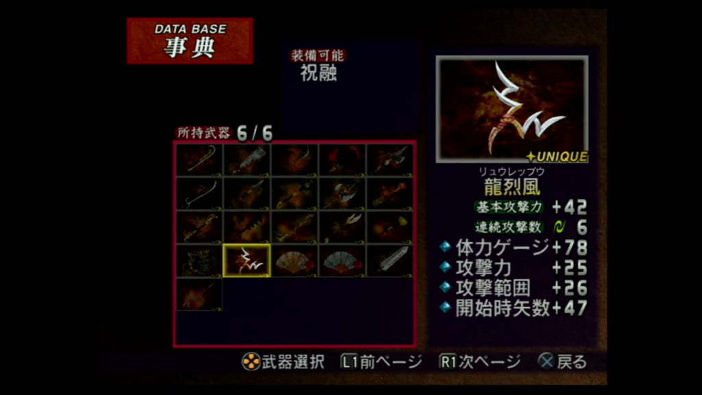 「オプション」モードの「ゲーム設定」で「難易度」を「最強」に設定し、「無双モード」か「フリーモード」の「オリジナル」で以下の条件を満たすと、「その他」の「第5武器」が手に入るぞ。