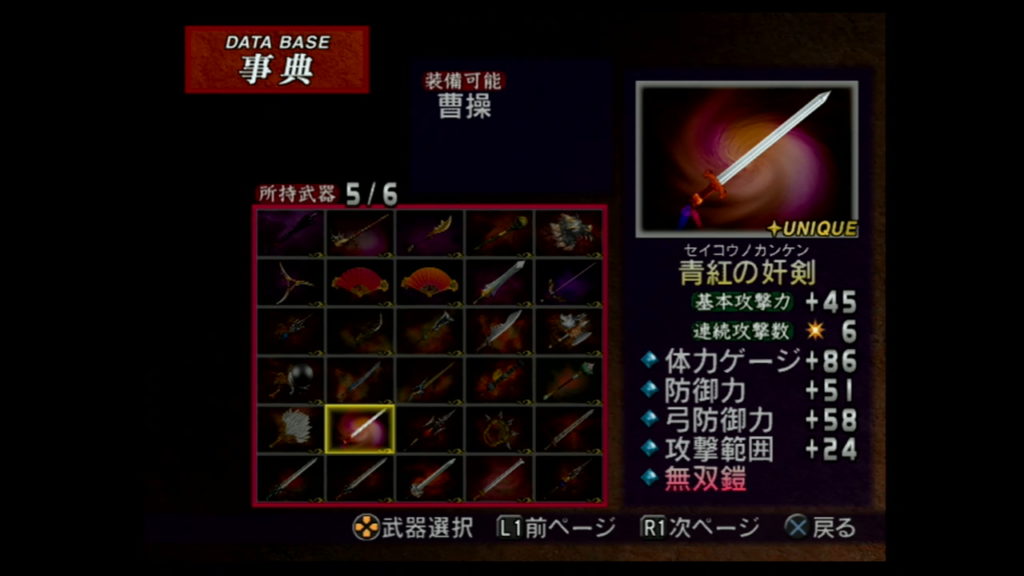 「オプション」モードの「ゲーム設定」で「難易度」を「最強」に設定し、「無双モード」か「フリーモード」の「猛将伝」で以下の条件を満たすと、魏軍の「第5武器」が手に入るぞ。