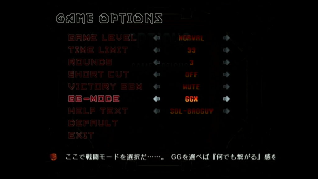 以下のいずれかの条件を満たすと、「オプション」モードの「ゲームオプション」に「GG-MODE」が追加され、「GG」と「GGX」が選択できるようになるぞ。