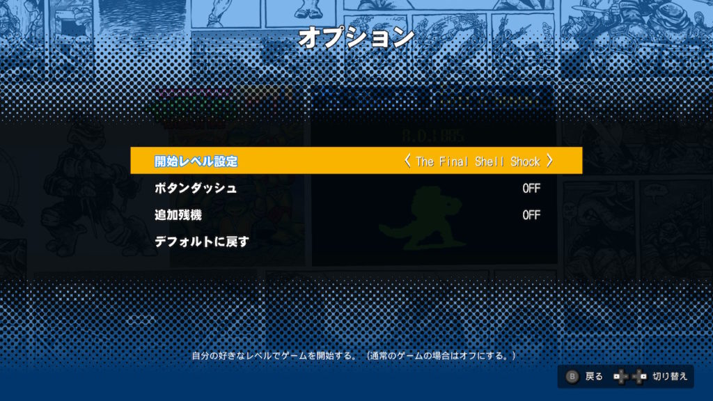 『T.M.N.T. カワバンガコレクション』ではこの隠しコマンドは使えないが、ゲーム開始前の「拡張機能」で「開始レベル設定」をオンにすることでステージセレクトが可能になる。